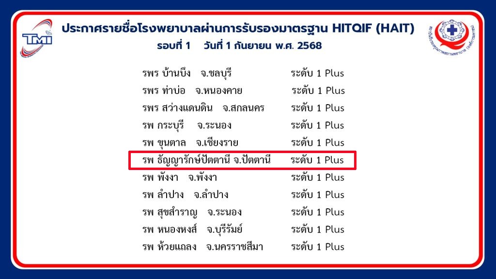 โรงพยาบาลผ่านการรับรองมาตรฐาน HITQIF (HAIT) ประจำปี 2568ประกาศรอบที่ 1: วันที่ 1 กันยายน 2568 Ref : https://tmi.or.th/2025/09/announce_results_hait_sep2025/https://www.facebook.com/tph.go.th/posts/pfbid0TuN7CqYGxMcauWpjE6of7d1jt6xCGsUcpsrshRJqx2UcSytdyJbF2x9kZso9CXpWl